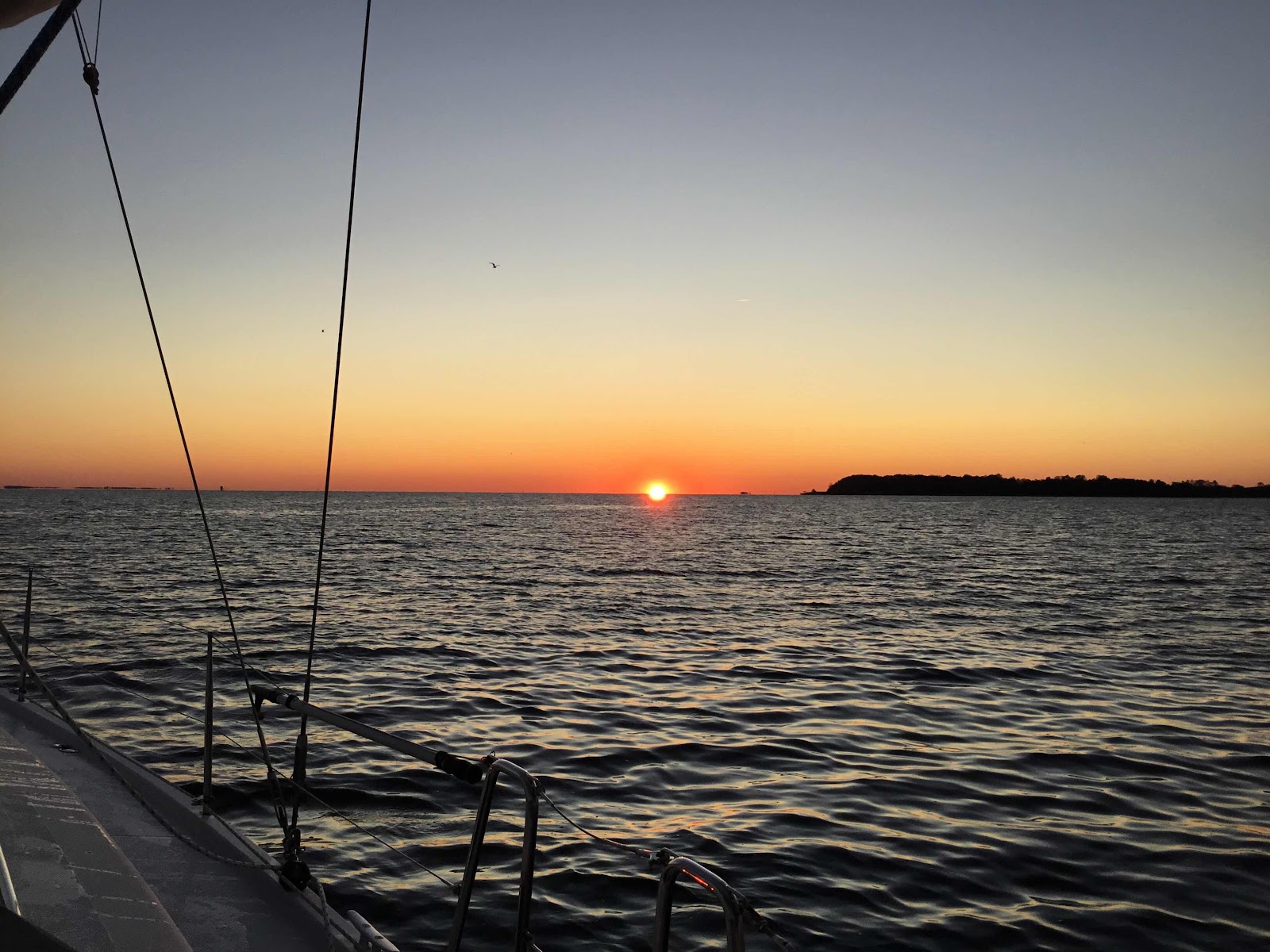 One thing I can say about sailing, there are always new experiences. Today’s new experience was rounding up on a downwind point of sail. For all of the non-sailing readers I will explain what that means. The boat rounds up (turns into the wind) when the boat is heeled over (leaning over) so much that the rudder (which is under the boat, is connected to the wheel, and does the steering) can no longer do the job of steering. When the boat can’t be steered it turns into the wind. We have had it happen when we have had too much sail up and are sailing upwind (when the boat it already heeled over). Today it happened when the wind was behind us and we weren’t heeled over.  When we left Solomons early this morning we were expecting winds in the mid-teens, gusting to twenty. When we turned south in the bay out of the Patuxent River the wind was as forecast. Our full main and no jib seemed to handle it just fine. However, the wind started to build to the mid-twenties with gusts to thirties. The seas started to build also and they were pushing the boat every which way. Just before we rounded up we were hit with a big gust, which heeled the boat over, then a large wave which heeled it over even further and pushed the bow toward the wind. At that point George lost the steering and the boat turned completely into the wind. It was so abrupt that he was convinced we had run over a crab pot. He didn’t want to start the engine to get the boat moving in the right direction again because he thought we might have a line caught under the boat. We didn’t, though, and we were soon underway again. It was quite a challenging sail until the wind and waves calmed down in the afternoon. They calmed down so much that we had to motorsail for a few hours. Feast or famine.