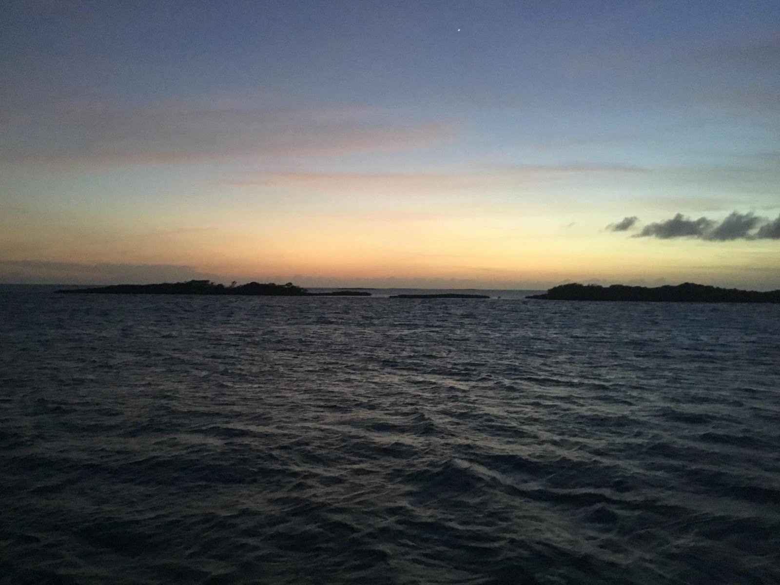 We left Cat Island before dawn this morning to make the 60 mile trip across Exuma Sound. We had good wind and sailed the entire distance. The wind caused the seas to be a bit lumpy, but not too horrible. Our original destination was Staniel Cay but when we heard Chris Parker’s weather forecast this morning we decided to go to Cambridge Cay instead. Chris’s prediction for tomorrow’s SW winds was higher than we had been expecting. Cambridge Cay has well-maintained mooring balls and good protection from west wind. We arrived just after low tide and saw a depth of 6.2 feet at the narrow, shallow entrance. Not much room to spare under our 5’ 8” draft!