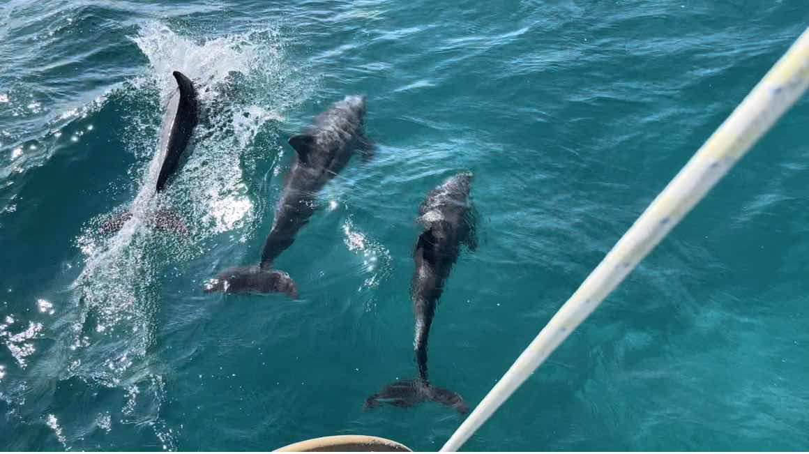 Sometime in the night last night the wind shifted from ESE to ENE causing the waves in the Pau Pau Bay anchorage to calm right down and give us a very peaceful night. We regretfully weighed the anchor this morning and started sailing back to Rock Sound. It was a gorgeous day for sailing—the sun was shining and the wind was just right. Not too long after we set out I noticed a dolphin swimming with us and I called out to George. He went up to the bow to watch them and get some photos and a video. They stayed with us quite a while, playing in our bow wake and we had so much fun watching them. It is late afternoon, the sun is still shining, and we haven’t had a squall (yet).