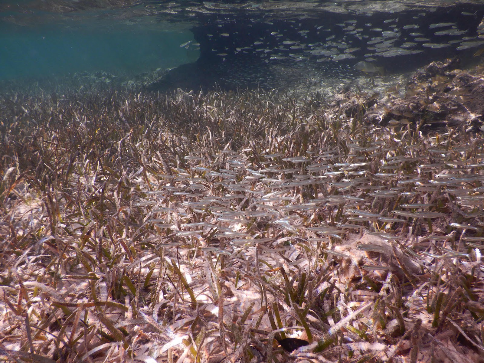 School of fish (I haven’t yet identified them) over turtle grass near ledge.