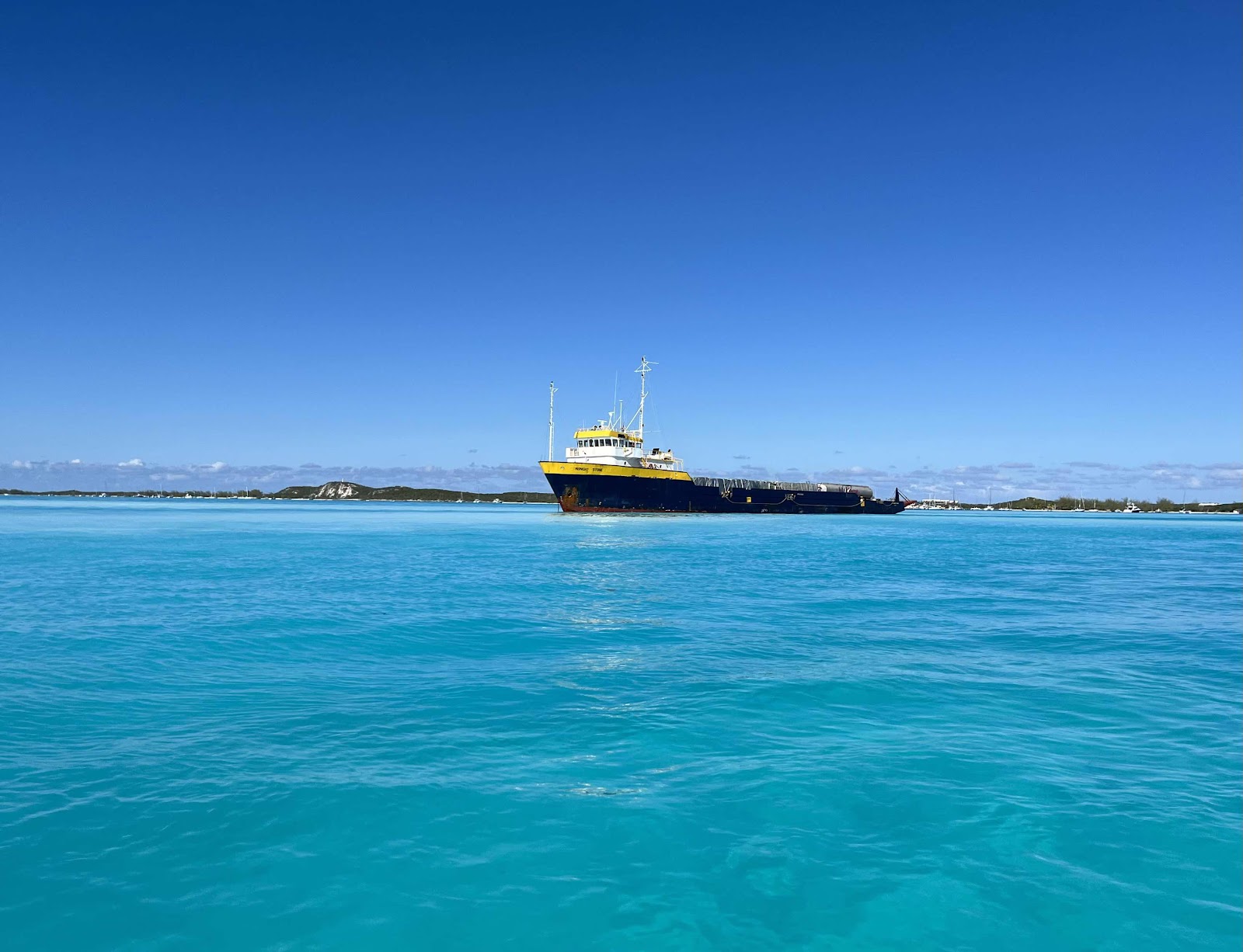 We left Staniel Cay just before dawn yesterday morning and had a great downwind 60 mile sail to George Town. We wanted to time our exit through the cut as close to slack tide as we could. Otherwise the wind would be opposing the incoming tide and we would be bashing into large, steep waves. We must have timed it right because the cut was quite calm. We anchored in Masters Harbour in the late afternoon where we had good protection from the NW winds. George ran the water maker this morning and it all went smoothly and our water tank is now full. Hooray! After that we raised the anchor and moved closer to town to make it more convenient to run a few errands. As we approached our anchorage we saw a supply ship which appears to have run aground trying to get to the government dock.