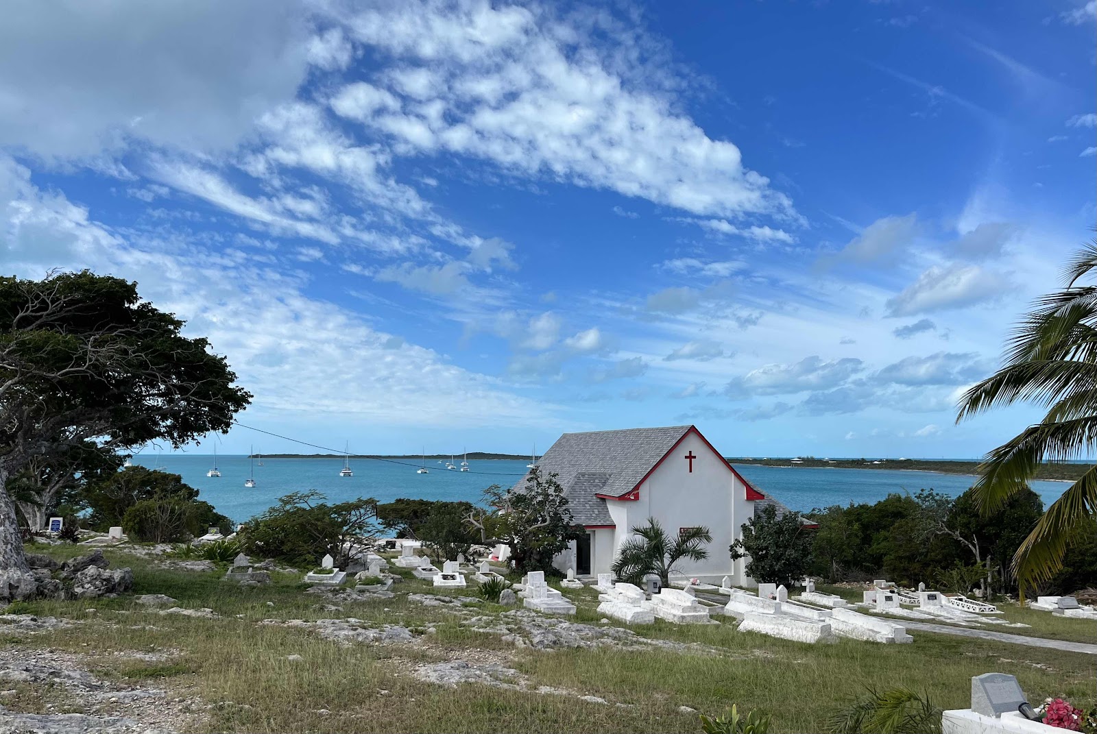 Yesterday we took a walk over to the east side of the island and walked along the beach. It is a beautiful beach, if you ignore all of the trash that washes up on the sand. Part of me wants to clean the beach up, but the other part of me realizes I wouldn’t accomplish much and it would be difficult to lug even a single bag of trash over the trail leading to the beach. I saw the remains of a raft and wondered if someone put it together for fun or did it have anything to do with refugees who come to the Bahamas from other struggling countries. Today we dinghied over to the cove cruisers often use to tie up their dinghies then walked south about a mile to the Hillside Food Supply store. We would have been closer to the store has we tied up to Basil’s dock but this way we were able to get some exercise. We passed by the St. Joseph Anglican Episcopal Church which has the most gorgeous view of the harbor.