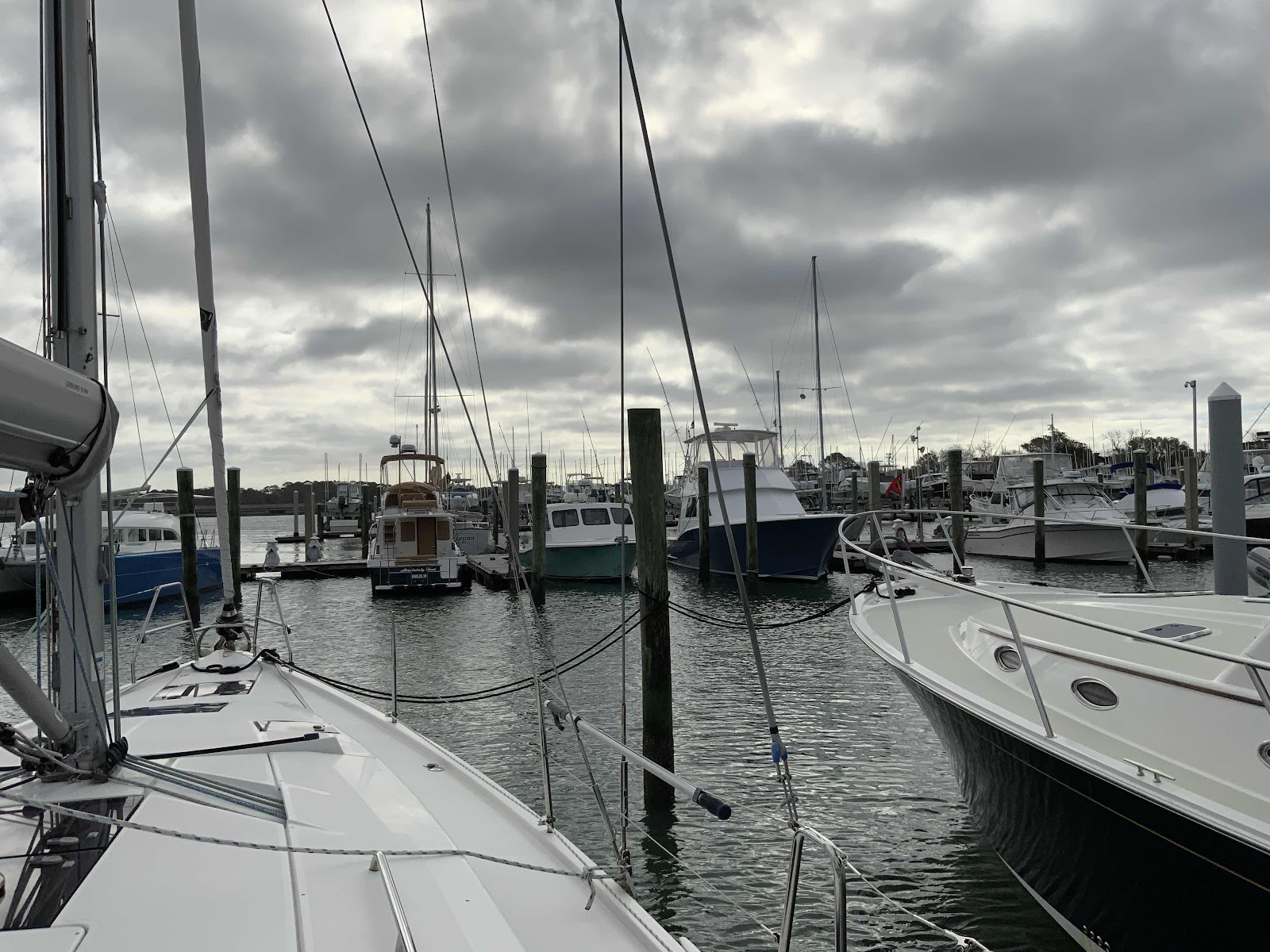 George’s topping lift fix held and the wire replacement is to be shipped here. A strong front blew through here last night and, although the boat heeled over in the slip, everything was nice and secure.