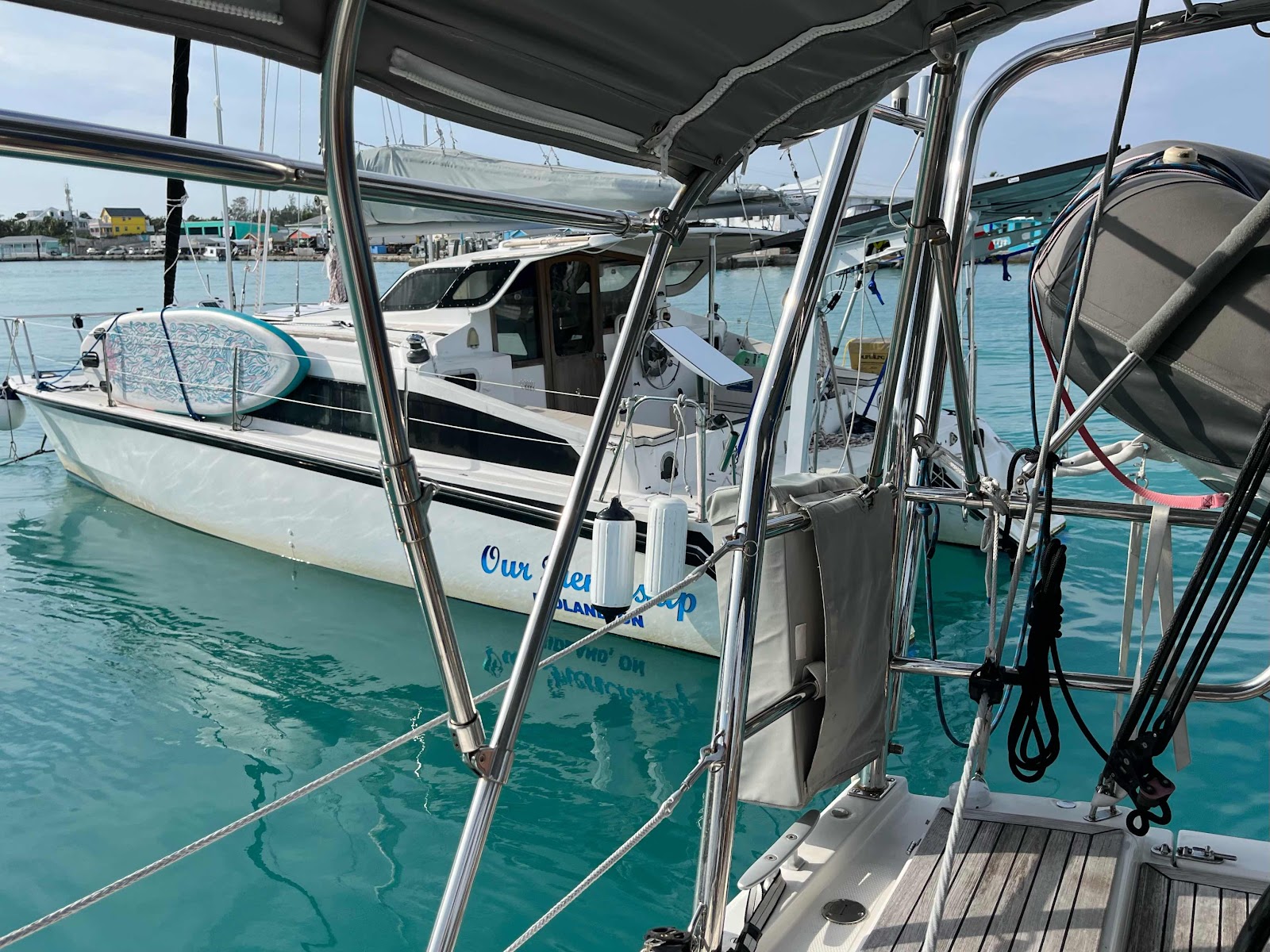 The small mooring field in Spanish Wells is such a well protected area that there is sometimes not enough wind to keep all of the boats pointed in the same direction. We were stern-to-stern with our neighbor several times yesterday. When George went up into the cockpit in the morning yesterday he saw that our dinghy was up against our neighbors Startink. Later in the day our boats came close to touching before they moved apart again.