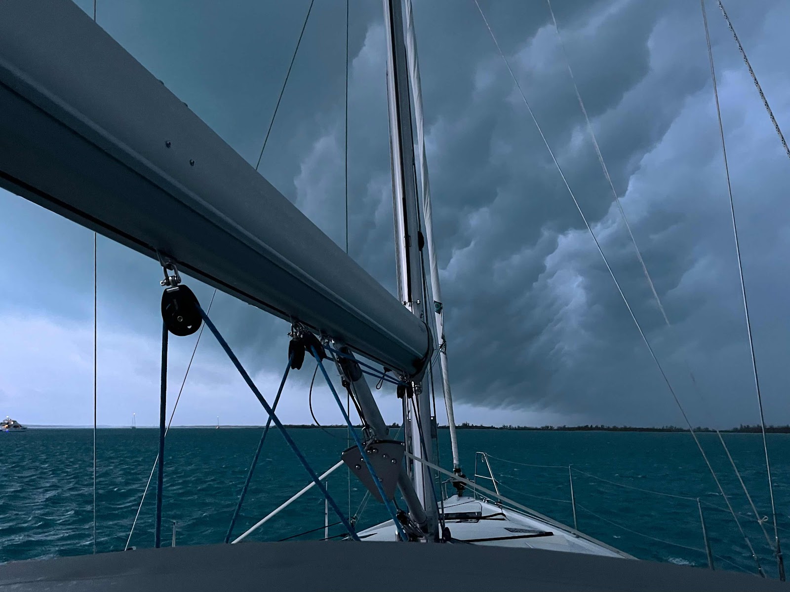 A squall rolled in shortly after I published yesterday’s blog post. We were quite happy that we arrived early and were settled by then. The boat next to us spent an hour in driving rain trying to get their anchor set. I am not sure why they had a problem—since anchoring in Rock Sound is not usually a problem. Just after the sun set last evening a line of strong storms hit. The wind shifted suddenly from SE to W—blowing at close to 40 knots. With the wind on the beam, Breeze On was heeling over. I took a quick photo before turning the engine on to help get the boat turned into the wind. By the time the engine came on the boat had turned itself. We had rain, wind, and lightning around us for a few hours before the storms finally passed.