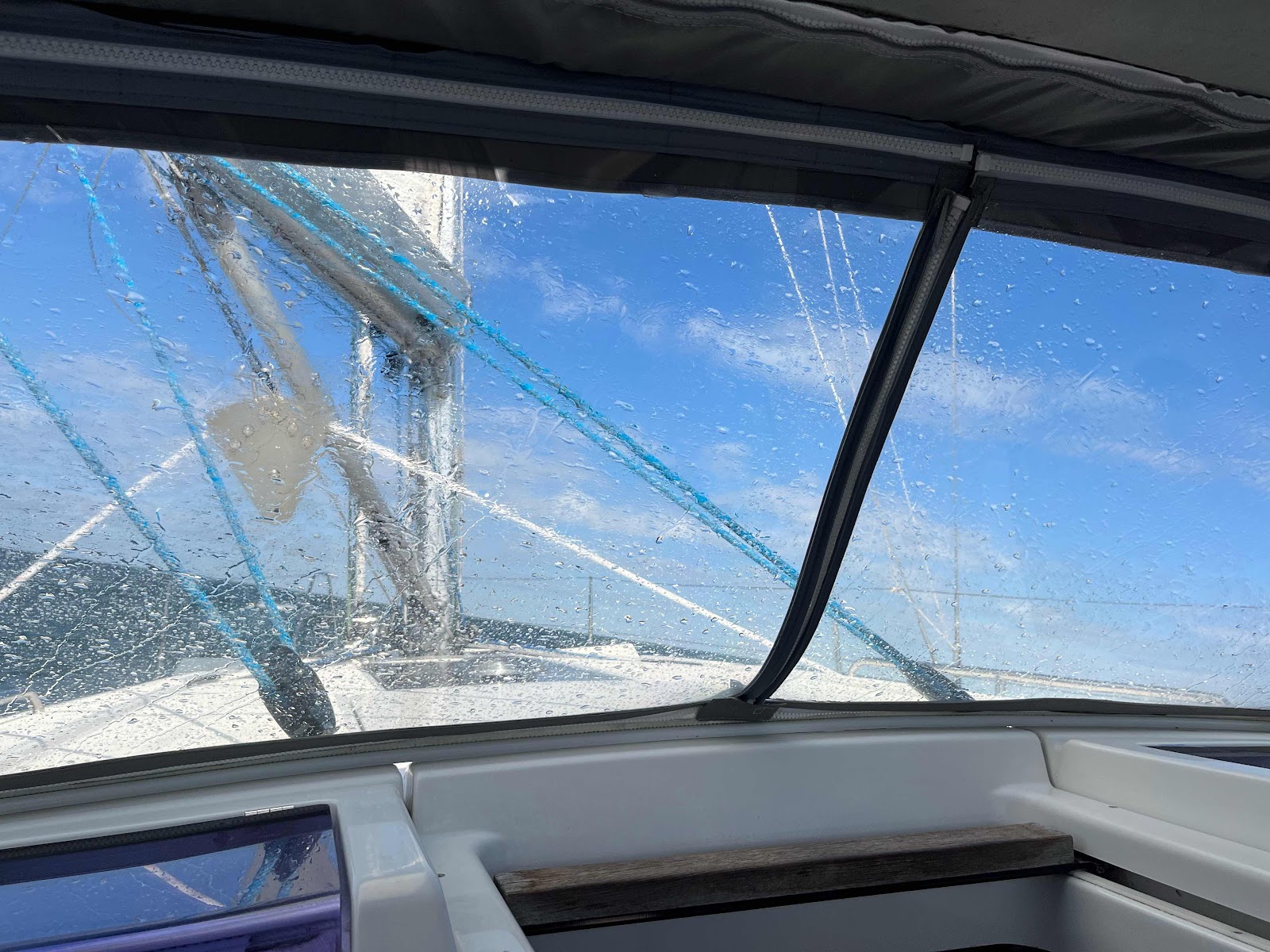 When we rounded Cape Lookout we were sailing at a higher angle so didn’t have to worry about unplanned gybes. The waves were larger, though, and more on the beam. Several splashed over the boat. We were very grateful to have the enclosure to keep us from taking cold, salt water showers.