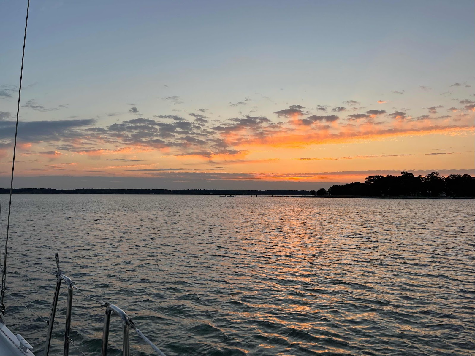 Our day started at 4 am when the wind shifted—as forecast—from the S to the NW. The whistling wind and creaking anchor chain snubber line woke us both. We slept very little after that. We left the Dun Cove anchorage just as the sun was rising and pointed toward the Chesapeake Bay. The forecast called for wind in the mid-twenties so we put a reef in the mainsail. We tried sailing with both the mainsail and the jib but the waves were pushing the boat every which way, making it hard to keep our small self-tacking jib filled. Since we had plenty of wind to keep us moving we bypassed Solomons and decided to go to either the northern shore of the Potomac or Ingram Bay, just S of the Potomac. In the end we chose Ingram Bay because we have been here twice before and knew it was a nice, calm, protected anchorage. In ten hours we covered 66 miles—almost all of it under sail—and are ready for a good night’s sleep.