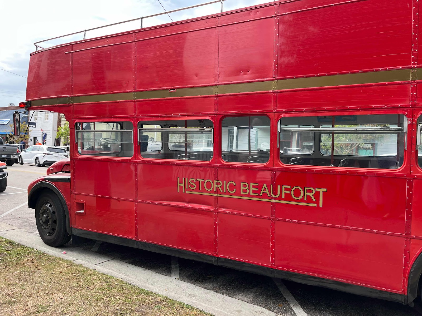 Our bus. It recently had a “new” (old) transmission installed. Nevertheless, whenever the driver had to back up to turn around, he had to turn the engine off and restart it to go in forward again. He did an amazing job driving around the narrow, crowded streets of Beaufort.