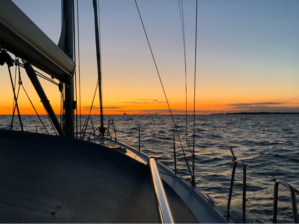 We left the anchorage at Old Point Comfort Point Hampton, VA well before sunrise. The trip to Beaufort is 32-36 hours—depending on our speed—and we want to get to the marina while it is open. We were exiting the Chesapeake Bay just before sunrise. There was quite a bit of ship traffic in the area so I stayed just out of the channel to make sure I was out of their way. This afternoon we heard someone on the VHF radio calling from a Naval plane to boats which were sailing many miles offshore. He asked them to change course for 40 to 70 miles to avoid a live fire area. We were quite happy to not be near there!