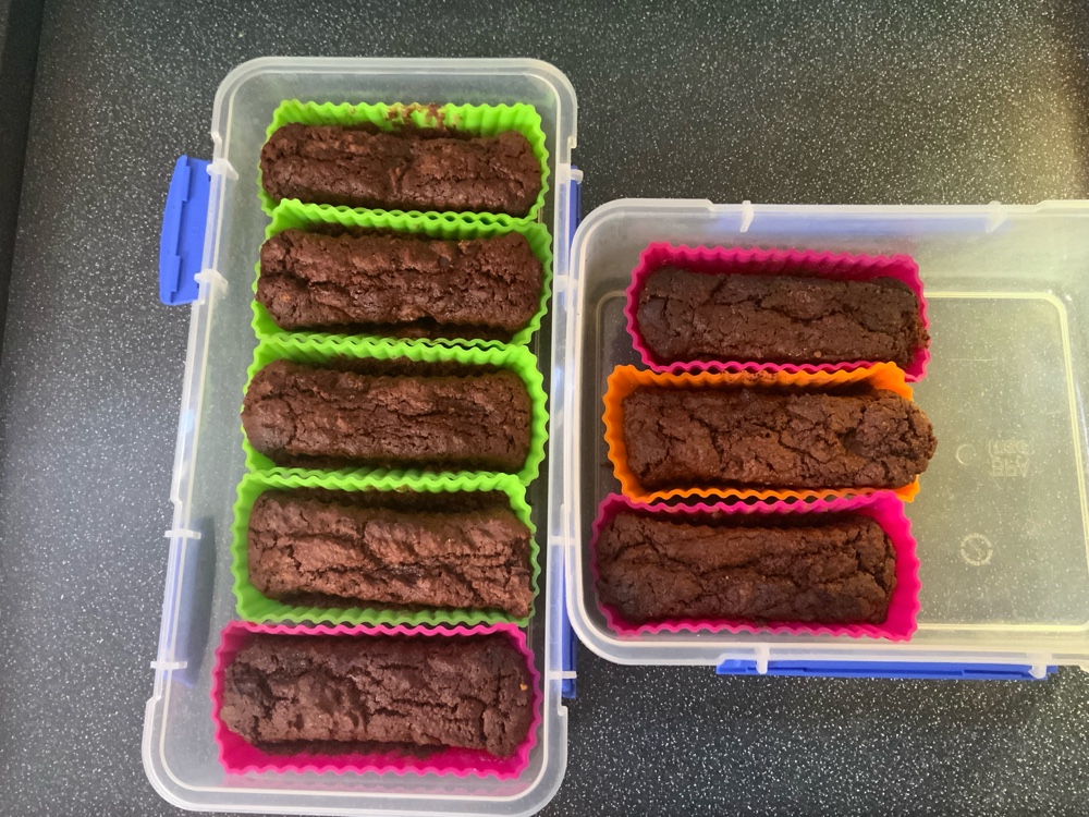 Brownie batter in small silicone pans lined up in baking tube ready to go into oven.