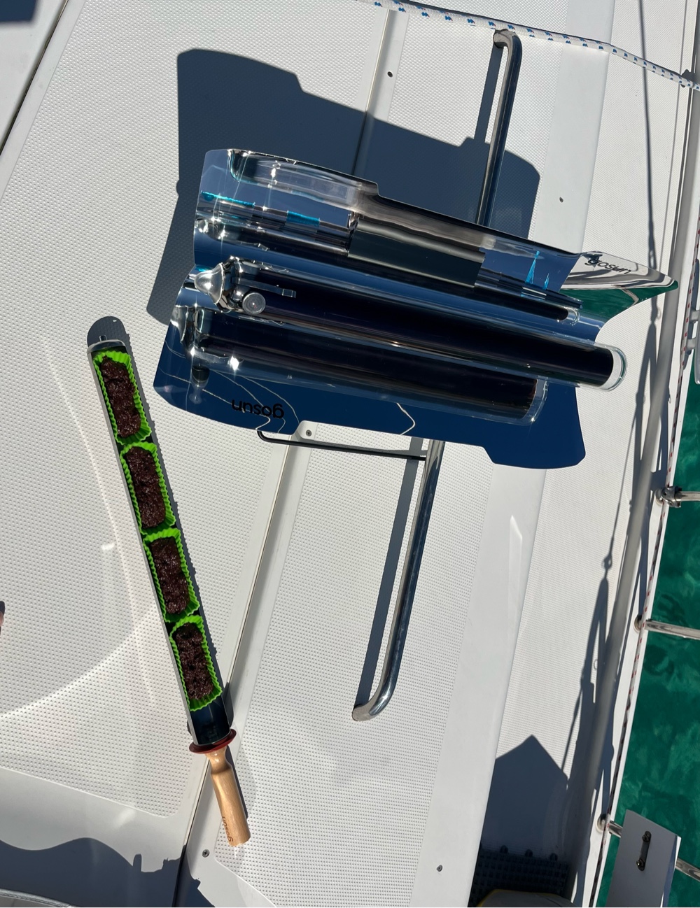 I baked a batch of brownies in our new GoSun solar oven after returning to Breeze On. The oven was recommended by Marla and Tommy, our friends on Alboe, and it is a big improvement over our last solar oven. I assembled and vacuum packed the dry brownie ingredients before leaving home. My recipe makes quite a few brownies so it took 2 1/2 batches in the solar oven to finish them. Each batch baked for about 45 minutes. We are quite happy with the results.