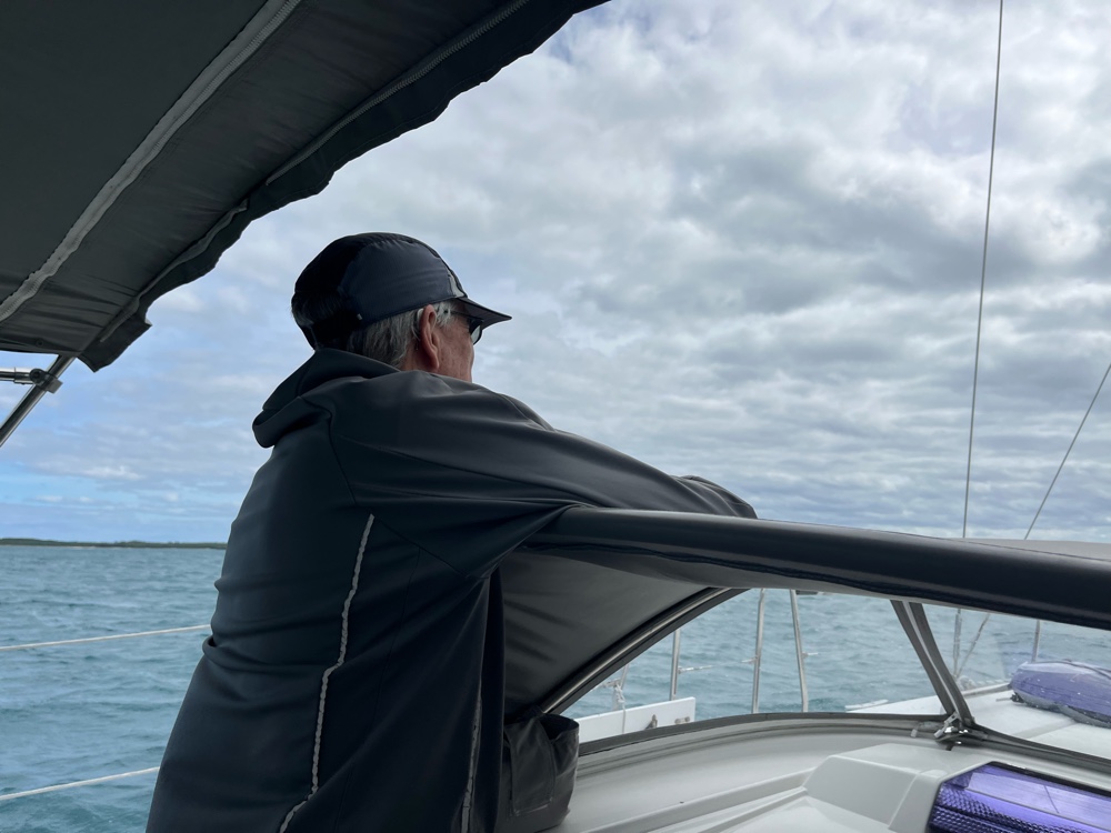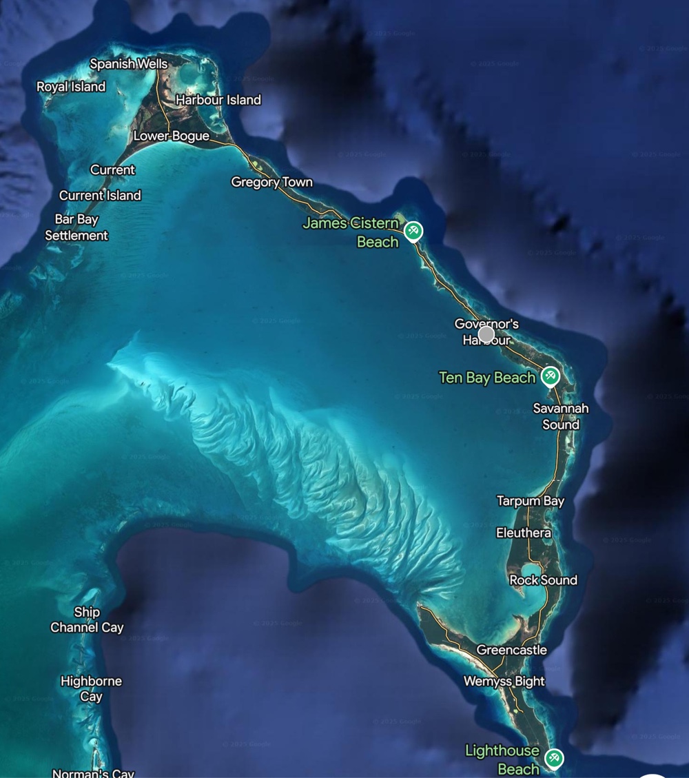 Eleuthera. You can see from the image that the water on the east side of the island is deep, while it is shallow on the west side. We often have very nice sailing on the west side, as we did yesterday and today.