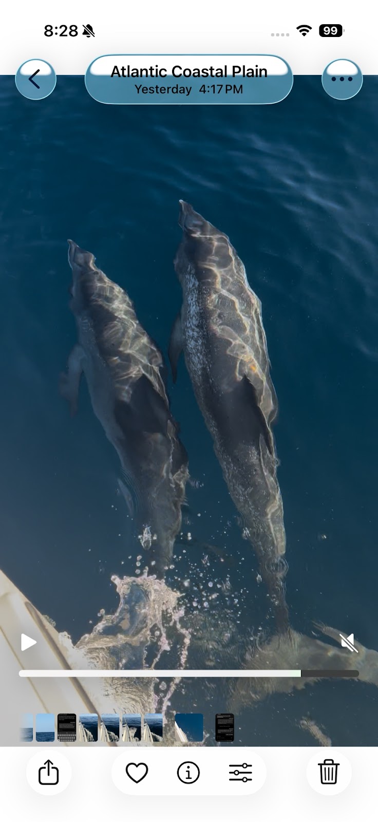 Screenshot of a video George took from the bow. The dolphins were racing back and forth in front of us.