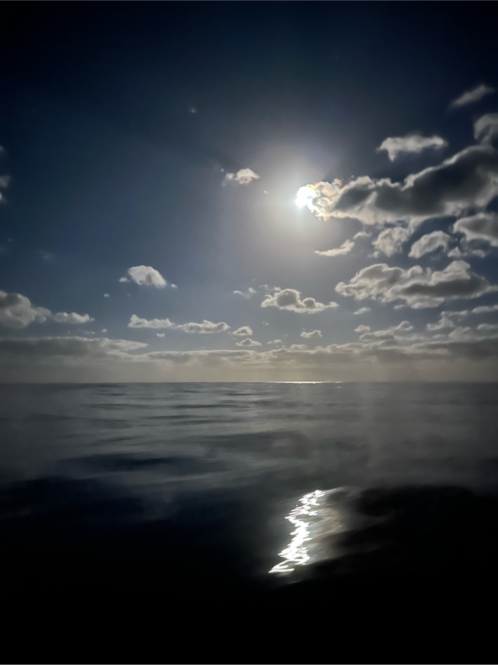 We entered the Gulf Stream last evening and exited in the wee hours of the night. The Gulf Stream can get gnarly with large, confused seas but the wind was light and the seas were quite calm. Even though I prefer sailing over motoring I am grateful for the calm conditions. Last evening I was in the cockpit on my watch when I looked up and saw an orange light in the sky. I grabbed my camera and took a photo. It took me a minute to realize it was a Starlink launch from Cape Canaveral.