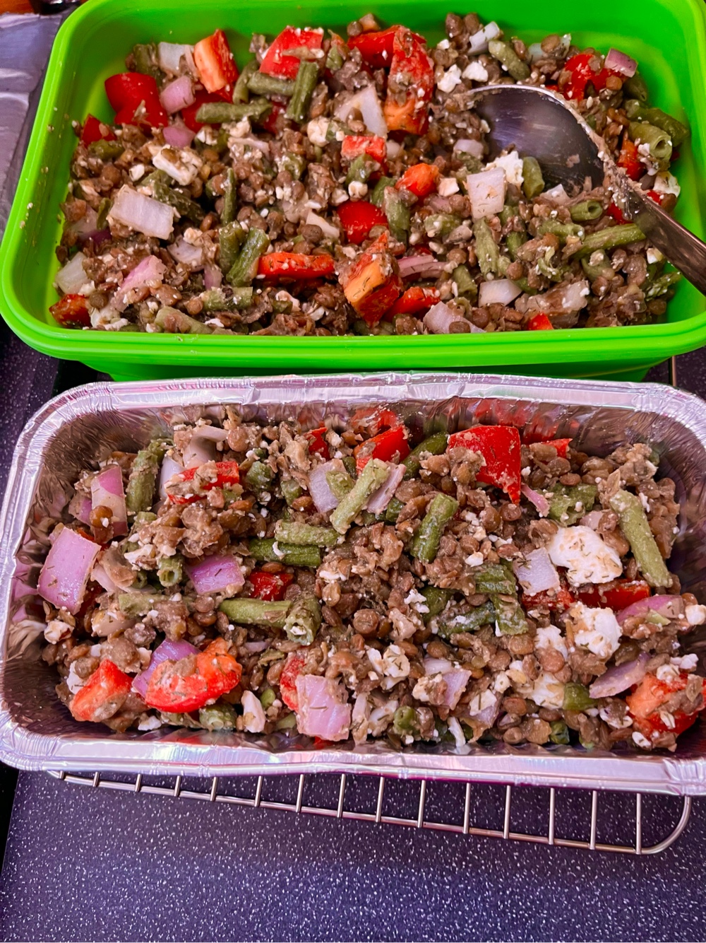 Lentil salad. The one in the aluminum tin is meant for Thursday’s meal. We generally use disposables on our passage to reduce time in the gallery doing dishes. We rarely use disposables otherwise.
