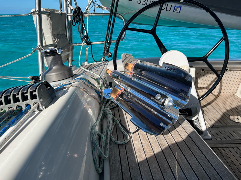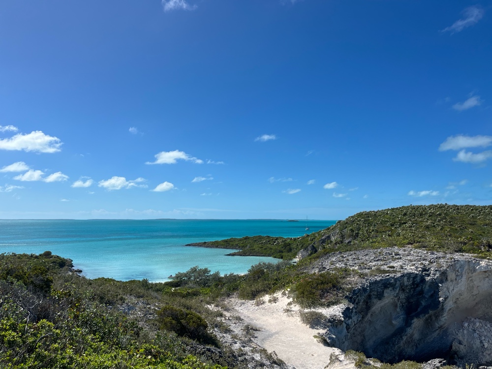 It has been lovely here in William’s Bay where, until a few hours ago, we had the anchorage to ourselves. We are now sharing this big space with one other boat! We spent the day yesterday working on chores—water maker, laundry, baking crackers—then went to shore for a brief walk in a very short beach. Some of yesterday’s crackers weren’t baked quite enough so today I re-baked them in the solar oven but over baked the last few. My technique needs some work. We went to shore again for a hike on a steep, rugged, rocky trail and were rewarded with some beautiful views on the east side of the island.