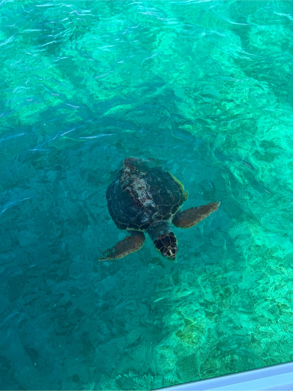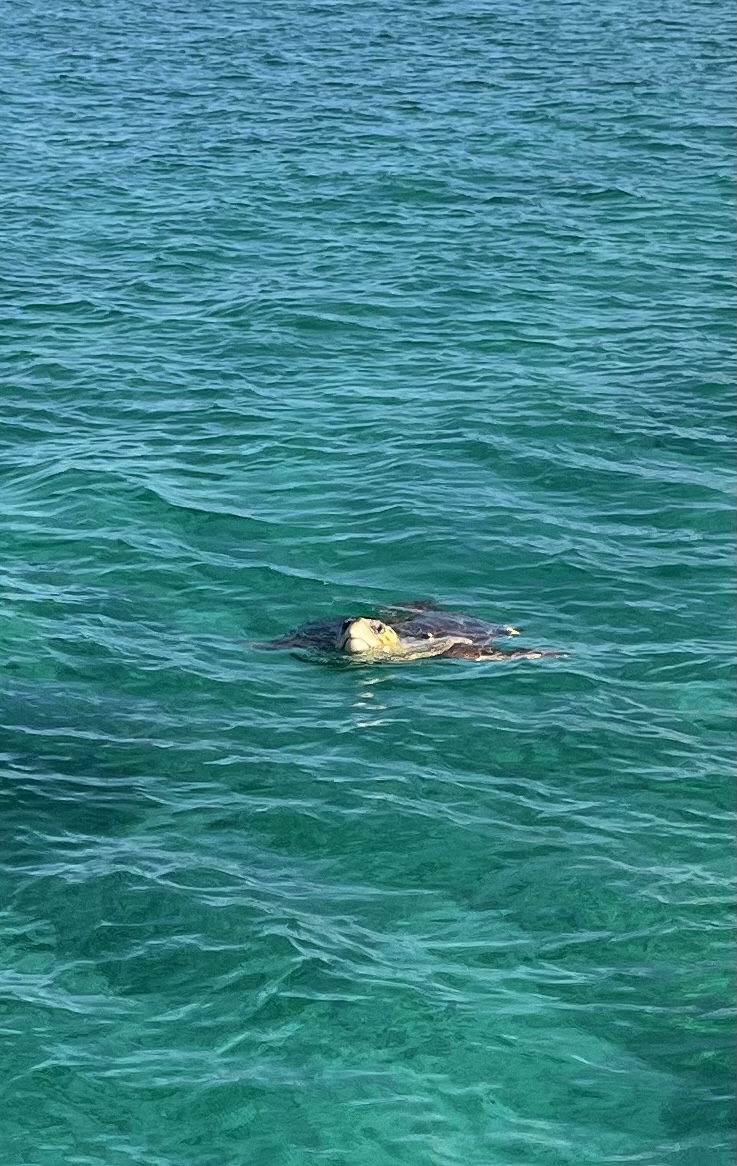 George noticed this sea turtle swimming under our boat. It is the biggest one we have ever seen—it has to be at least 3’ in diameter.