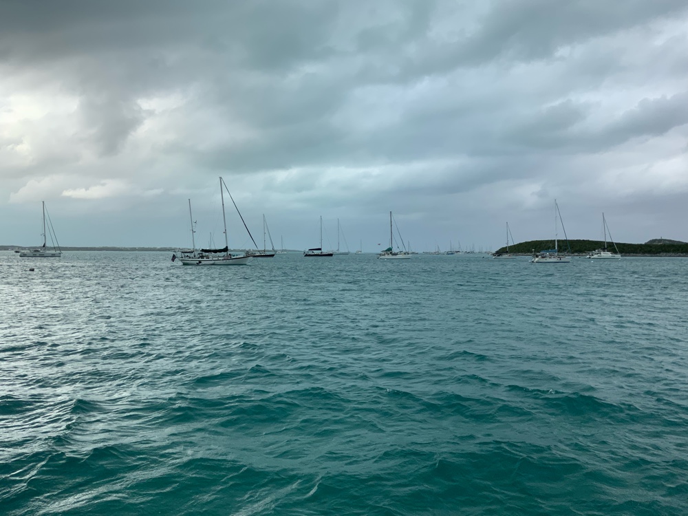 It has been gloomy for most of the day here. Boats are anchored as far as you can see and this is just a portion of the boats anchored in the large Elizabeth Harbour.