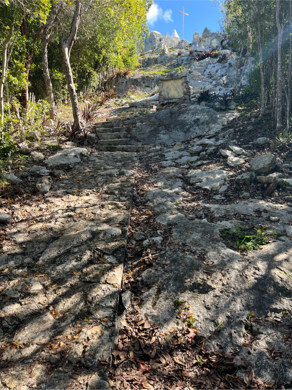 This morning we walked up Mount Alvernia to the Hermitage. At 206’ Mount Alvernia is the highest peak in the Bahamas. The Hermitage was designed by Father Jerome—an architect who became a priest—and built by Bahamians. It was designed to resemble a 3/4 scale medieval monastery. Even I have to duck to enter the doorways.