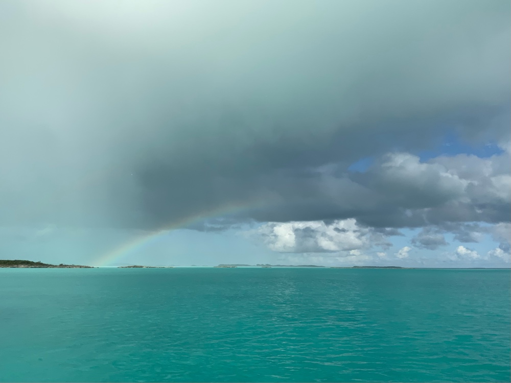 Our package containing the new mainsail feeder track arrived at Staniel Cay Yacht Club late yesterday afternoon. There was a moment when we were concerned that it hadn’t arrived. George watched as the golf cart bringing the packages from the airport to the yacht club was unloaded and there weren’t any packages the size of our part. He was relieved when they said another golf cart was on the way. As soon as we got back to the dinghy with our package we raised the anchor and motored six miles south to Black Point, dropping the anchor just after sunset. This morning we were underway to George Town before sunrise. Although we were motoring into the wind the conditions weren’t bad since the wind was so light. We had just finished anchoring in George Town when a brief heavy squall arrived. We will stay here a day or two until the worst of the next cold front passes.