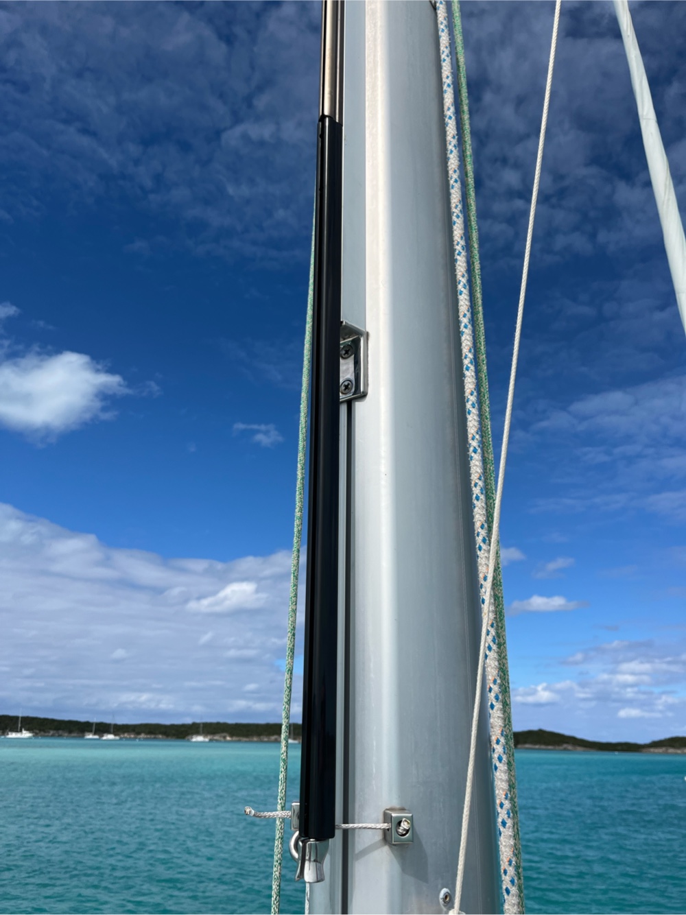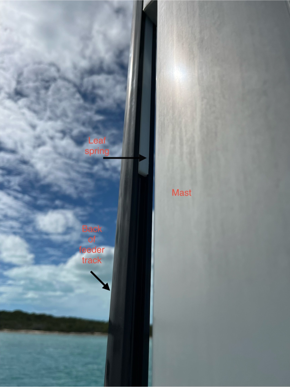 I forgot to mention in my last post that our daughter and son-in-law brought the leaf spring that we needed for the mainsail track (plus a spare) and George attached it and the new feeder track. Breeze On can be a sailboat again.