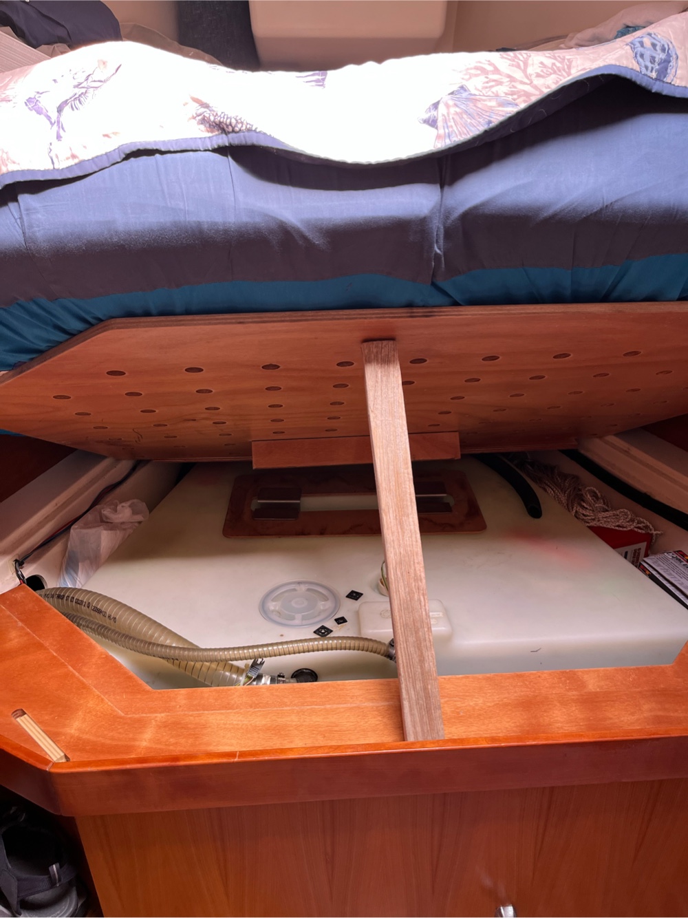 The water tank is under our berth. George props it up so he can eyeball how much water is in the tank. We definitely do not want to overfill it.