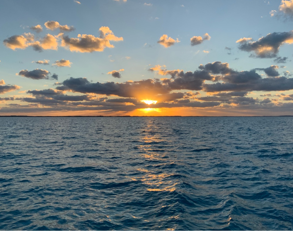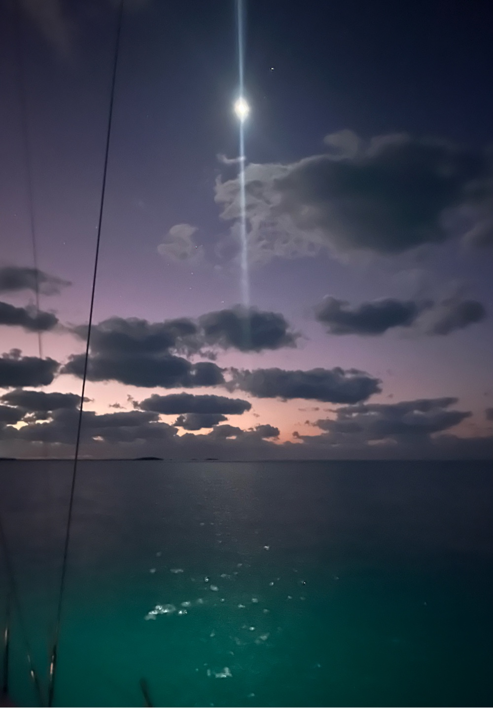 The sky as we were leaving this morning. The moon was actually a crescent moon. The lighter colored water around us came from the glow of the steaming light on our mast. Since the sun wouldn’t rise for another 45 minutes we were using our navigation lights.