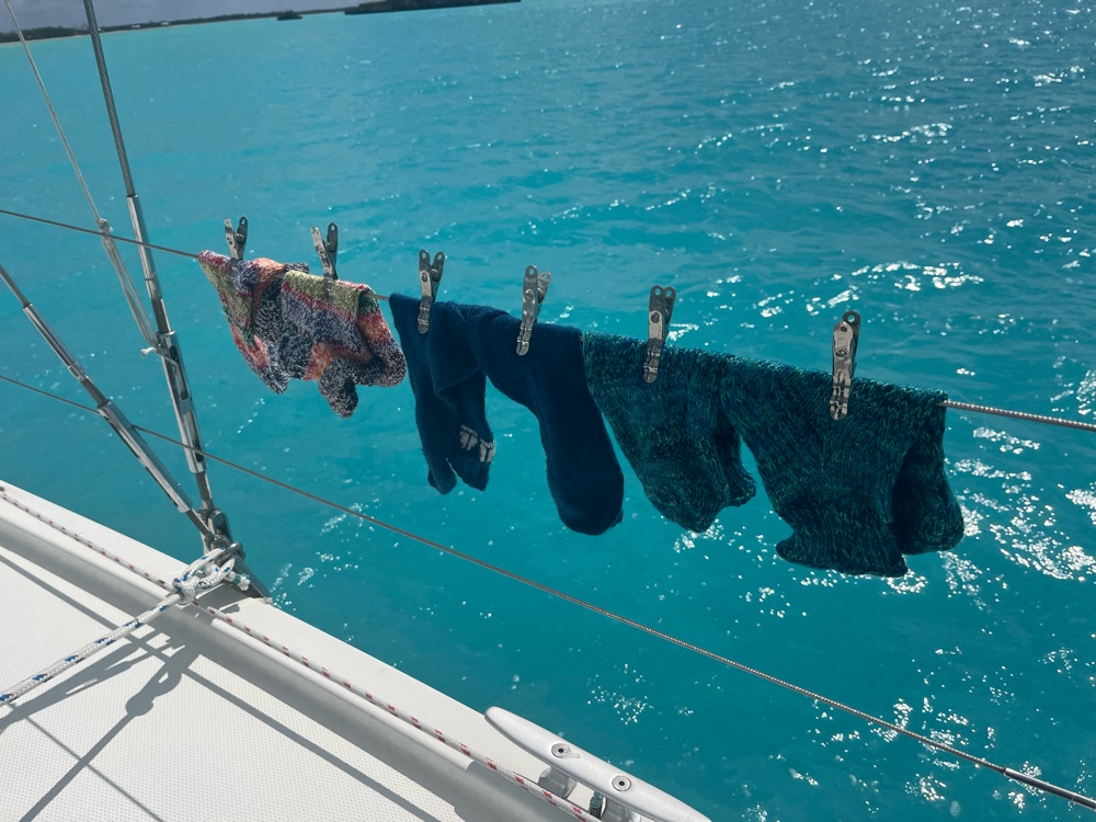 We left the Thompson Bay anchorage yesterday morning and sailed-SAILED!-ten miles N along the coast of Long Island to anchor at Dilda Rocks. It was a treat to be able to raise and lower the mainsail again without any trouble. Once we were anchored George ran the water maker and I did a few loads of laundry. We normally hang the bed sheets on the jib sheets (lines) on the foredeck. The wind was blowing the sheets so much, though, that the blowing sheet would pull the clothespins off. We eventually had to hang the sheets from the bimini in the cockpit, and even then they would become disconnected.