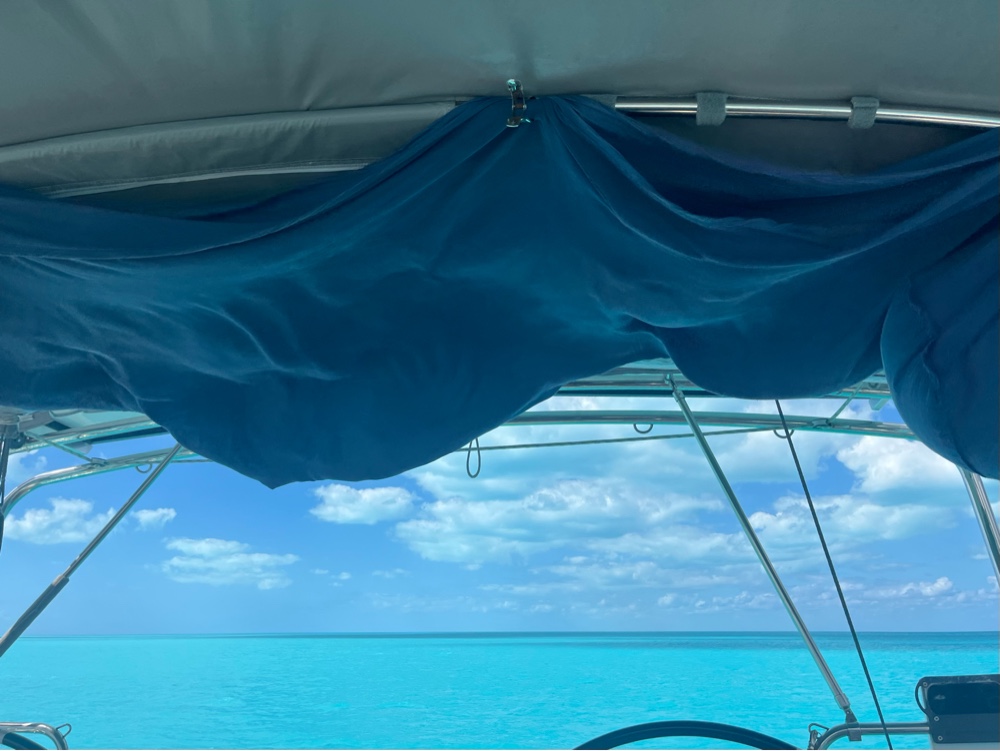 The sheet is clipped to the frame of the bimini and blowing in the breeze. Shortly after I took this photo a clip fell off.