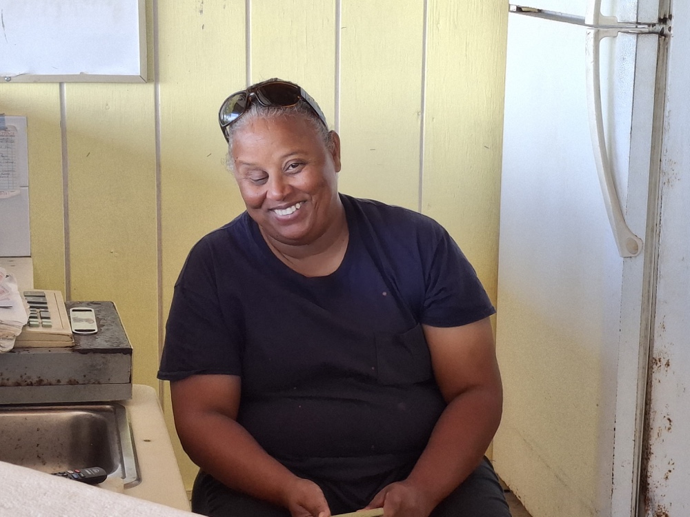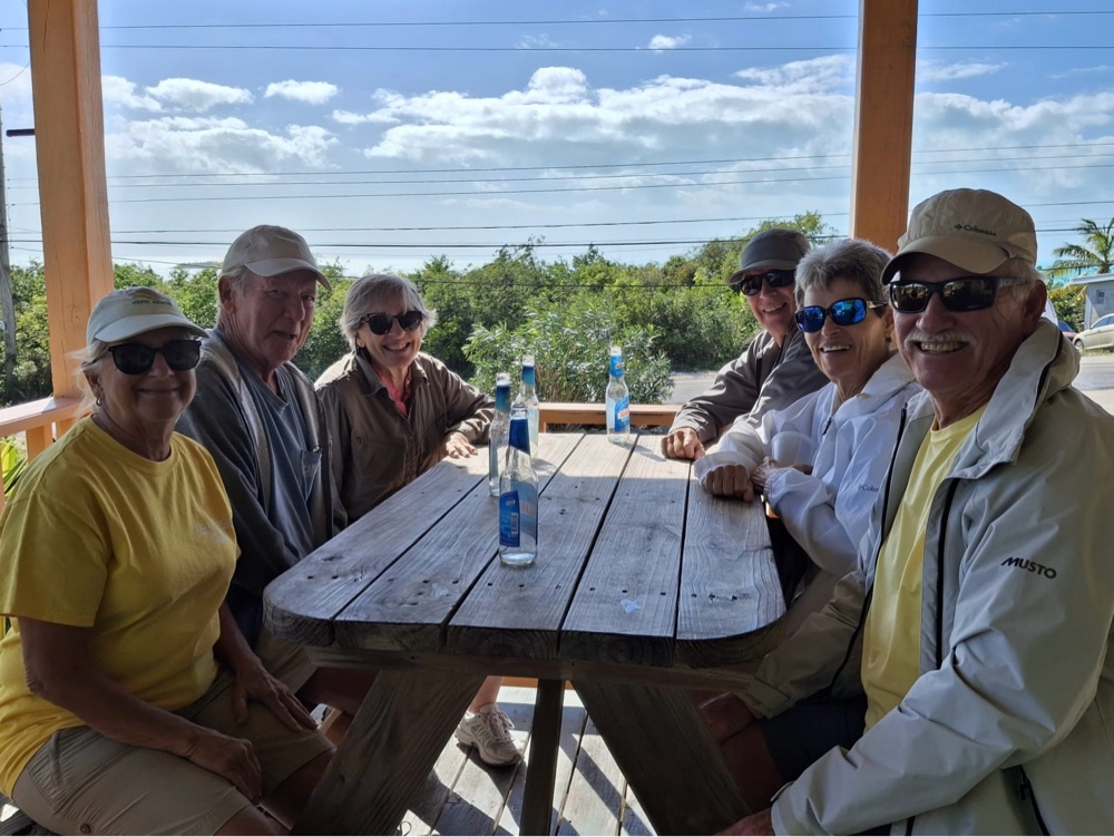 The NW wind has made the large harbor here at Thompson Bay choppy at times but we have still been able to get to shore both yesterday and today. Yesterday we dinghied into the cove with Dee & Ron and Jean & Michael and walked nearly a mile to Sou’ Side for lunch, then stopped at Hillside Food Supply for groceries. We were grateful that the stock at Hillside was much better than that at Exuma Market in George Town, where the produce section is bare at times. Early this morning we dinghied back to the cove and walked the mile to the farmers market. Once again I was pleased with my purchases—callaloo (a green similar to spinach), arugula, scallions, coconut tart, eggs, local honey, and sapodillas. I also tried a few things that were new to me—fever grass (similar to lemon grass), and Malaysian apples. Early this afternoon I baked a batch of brownies. I baked the first four brownies in the solar oven—that is all that will fit at one time—but clouds rolled in so I baked the rest in the propane oven. It is so cool here right now that we didn’t mind the extra heat in the cabin from the oven.